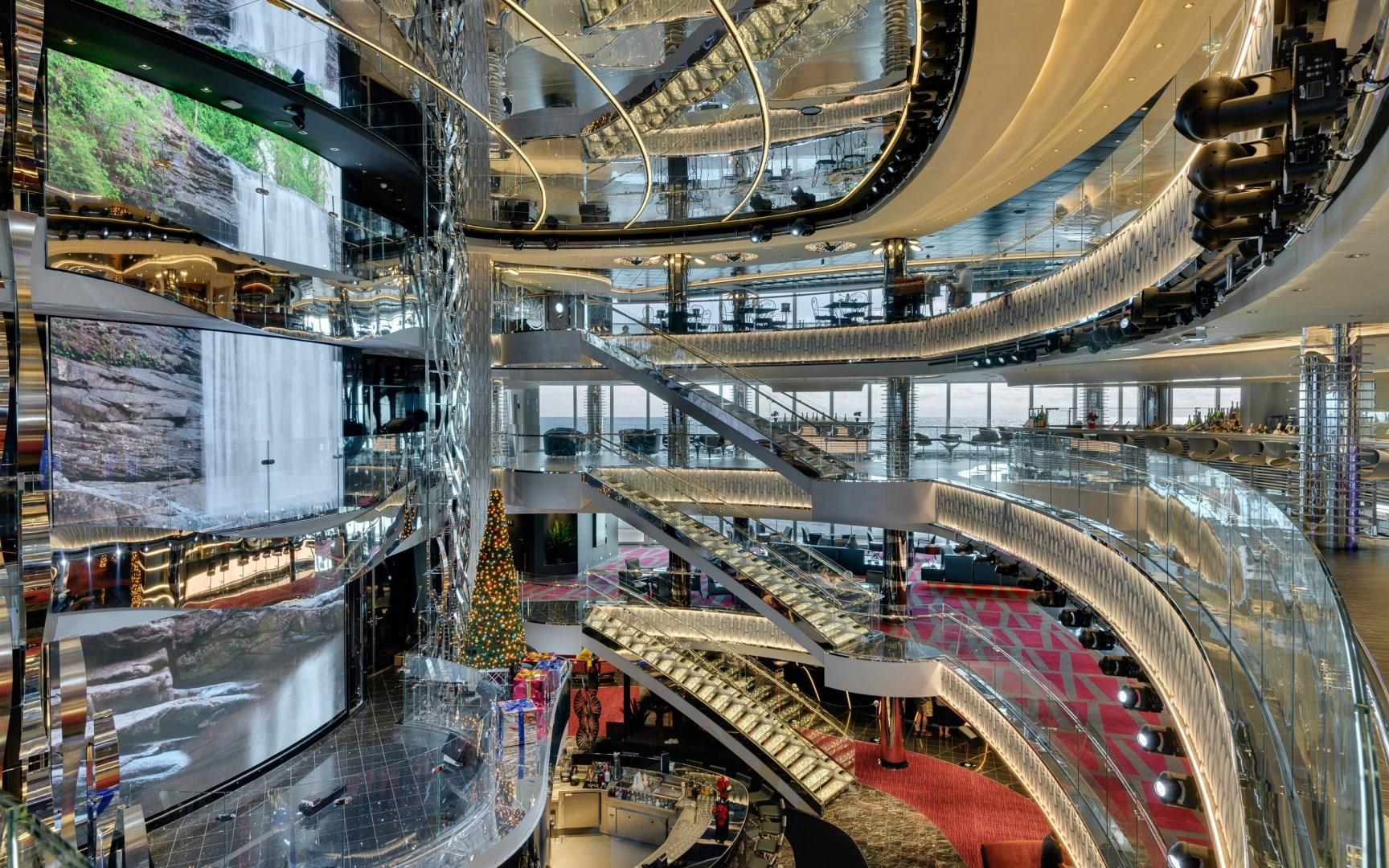 The multi-level glass-walled atrium stretches over four decks, creating an atmospheric venue where guests can enjoy live entertainment and panoramic vistas. The two glass-floored catwalks outside the atrium offer guests a jaw-dropping view downwards.
